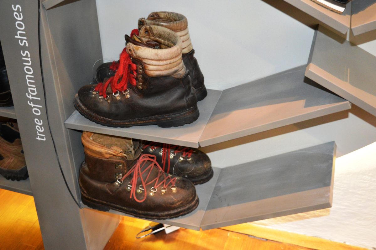 The pair of shoes that used to belong to Helena Blagne, dubbed diva of Slovenian pop, are also there (middle), as well as mountaineer Viki Grošelj’s climbing shoes.